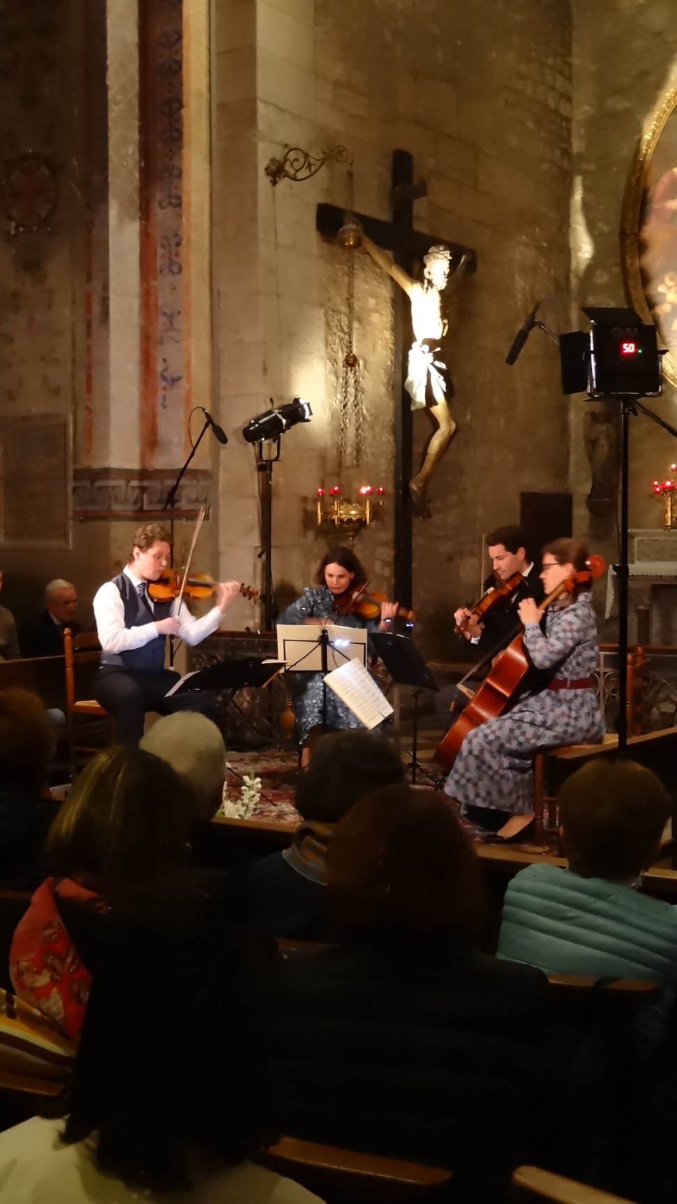 Quatre instruments à cordes dont la musique nous a fait vibrer passant de fragments doux et mélodieux à des parties plus vives car forté ; d’autres moments plus « mozartiens », d’extraordinaires passages avec une montée graduelle de pizzicati...