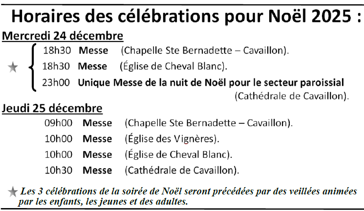 • Dimanche 14 décembre, 10h, à Cheval Blanc, messe de l’Étoile animée par les enfants du catéchisme et les jeunes de l’aumônerie.