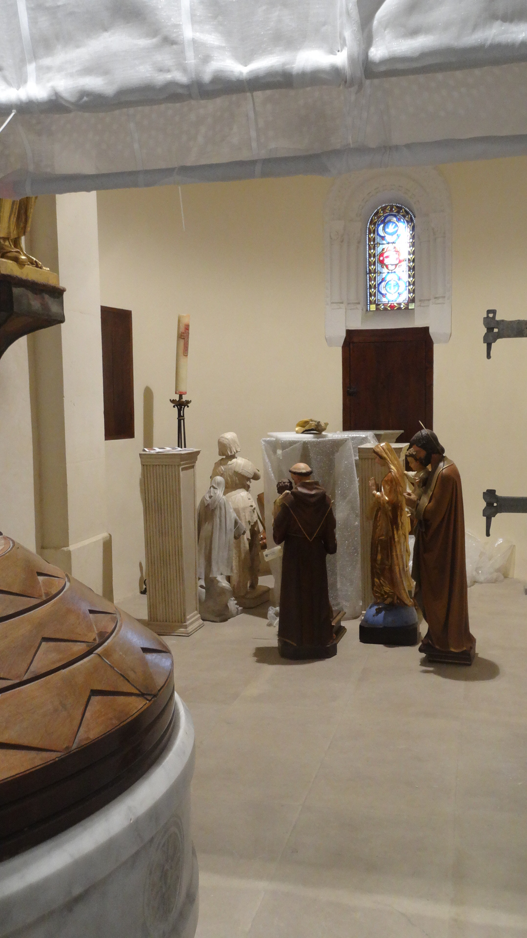 • D’autres, regroupés au fond, au delà du baptistère, forment une crèche de santons autour de ... je ne vois pas quoi...